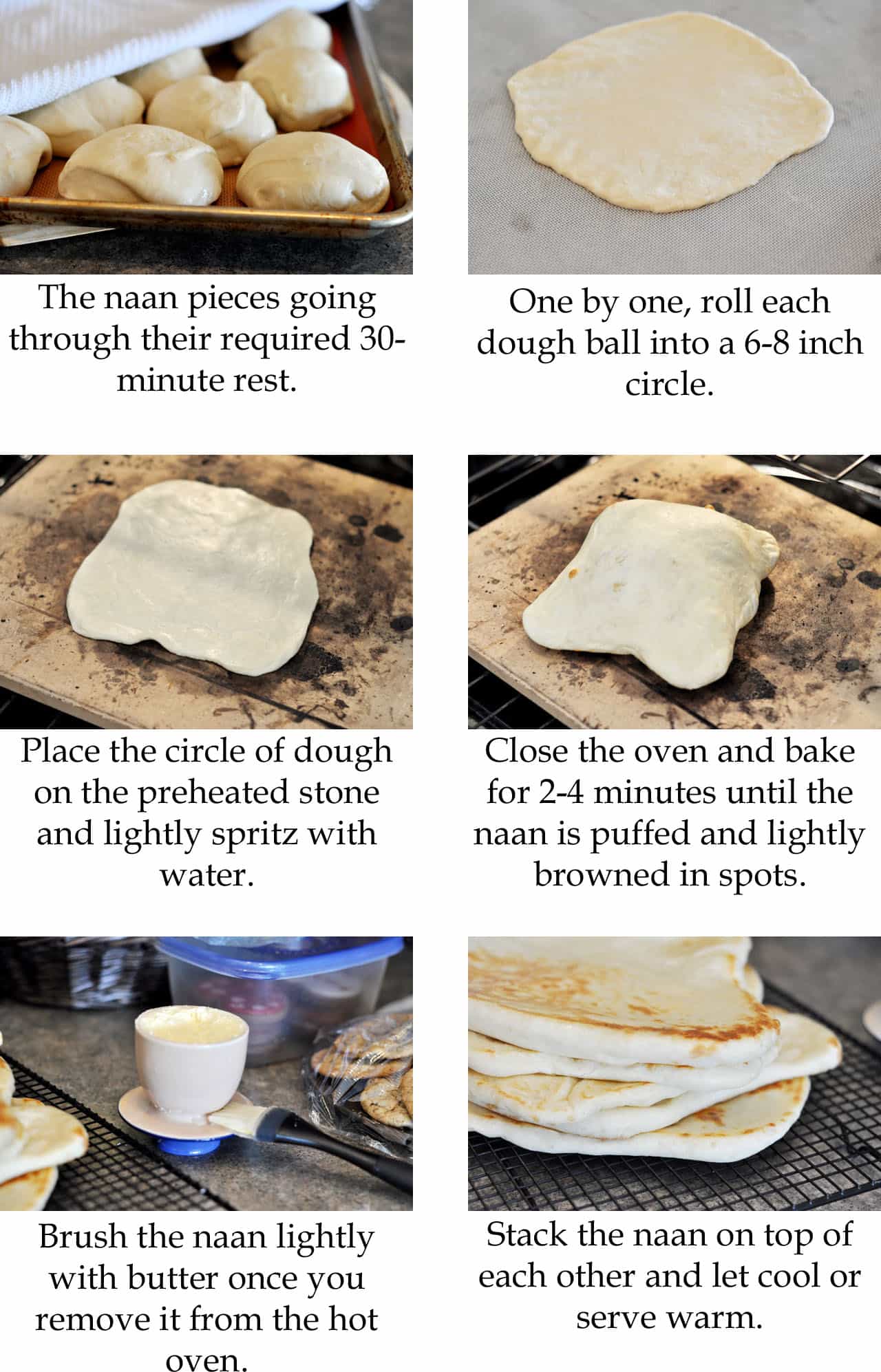 Once the dough has rested for 30 minutes, one by one, roll each piece into a circle about 6-8 inches wide, depending on how thin or thick you want your naan. Lay the circle of dough on the hot pizza stone and spritz lightly with water. Close the oven and bake the naan for 2-4 minutes, until it is lightly puffed (some pieces will puff more than others) and brown spots begin to appear on the top. Remove the naan from the baking stone and place on a cooling rack. Brush lightly with melted butter (garlic powder mixed in the melted butter was pretty tasty, too). Stack the hot naan on top of each other as it comes out of the oven. Cover with a towel and let the naan cool completely or serve warm.